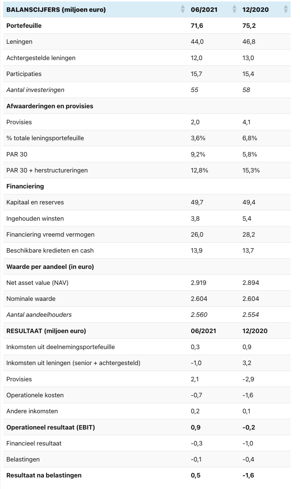 Gezien het voorzichtige investeringsbeleid dat Incofin nog steeds toepast, blijft de grootte van de portefeuille met 72 miljoen euro stabiel ten opzichte van einde 2020.